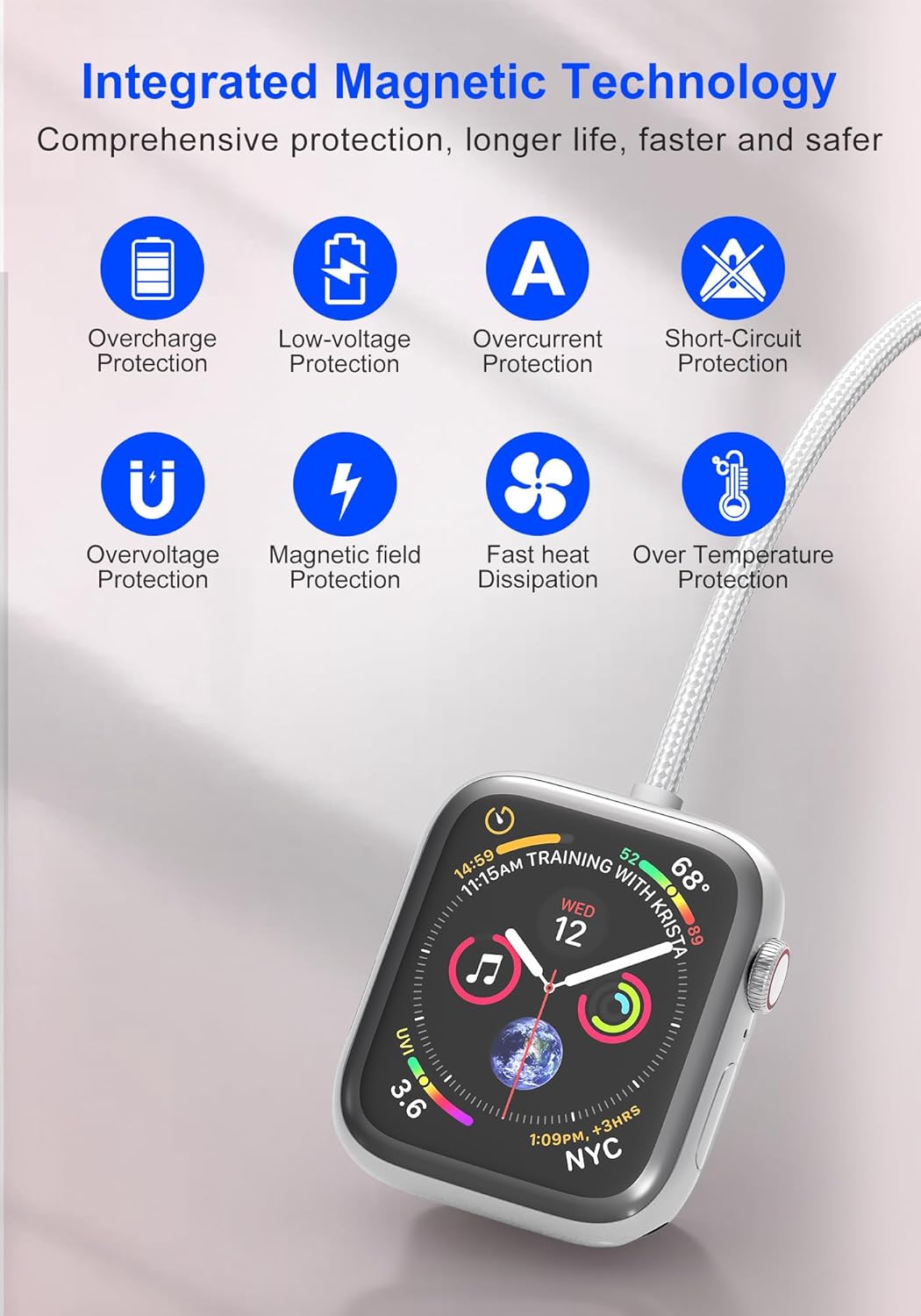 【Magnetic Apple Watch Charger with Secure Fit】The built-in magnetic apple watch charger offers strong adsorption, snapping perfectly into place on any Apple Watch series (Ultra/8/SE2/7/6/SE/5/4/3/2/1) for stable, efficient charging. Designed for iwatch charger fast charging, it provides a reliable experience without slipping. (Note: no iwatch case for better charging speed).