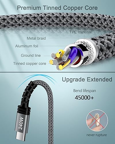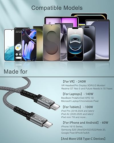 【Universal Compatibility】: 240W USB-C to USB-C Cable with Adaptive Power Delivery, Compatible with all urrent & upcoming type-c devices, for Samsung Galaxy S25 Ultra/S25+/S25/S24/S24 Ultra/S23/S23 Ultra/S22/S21/S20/Note 20/A17/A56/A55/A36A/26/A16/A15/A14 5G/A35/A25/Z Fold 7,6/Z Flip 7,6, Google Pixel 9 Pro XL/9/8/8Pro/7/7Pro/6/6 Pro/5, iPhone 17/17Pro Max/Air/17 Pro/16 Plus/16e/16 Pro Max/16 Pro/16/15/15 Pro/15 Pro Max/15 Plus, MacBook Pro/Air, New iPad Pro/Air/Mini, and more type c devices.