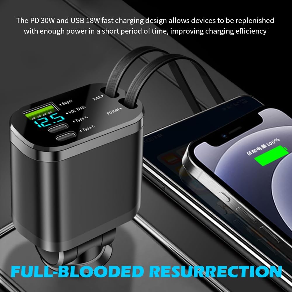 Upgraded Design: 5-in-1 and retractable design fast car charger, integrated 2 type-C ports, 1 USB port, 2 retractable USB-C cables, easy to solve the problem of insufficient charging ports in the car, retractable design can be flexibly adapted to the different seats of the equipment