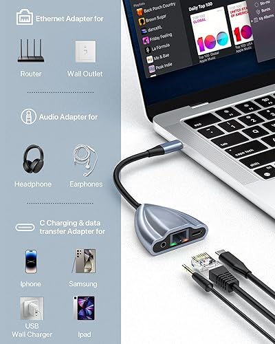 4-in-1 Connectivity: Equipped with a 1Gps Ethernet port, a 3.5mm jack headphone port, and a USB C 60W PD-IN port, giving you an incredible range of functions—all from a single USB-C port. The USB C 60W PD-IN port supports not only charging but also support data transfer.