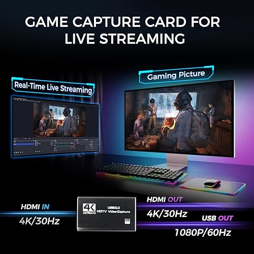 【4K Loop-Out & 2K30 Capture, YUY2 Supported】This 4K HDMI video capture card for streaming supports 4K@60Hz input and loop-out,1080P@60Hz USB3.0 output. The HDMI to USB video capture supports YUY2 format for high-frame-rate video capture and smooth real-time game streaming and recording.(Note:Max HDMI input is 4K@60Hz when HDMI out is not connected.If HDMI output is connected, the highest resolution HDMI input can receive is subject to the display and the resolution is no more than 3840*2160@30Hz. — e.g. 1080P monitor allows max 1080P input; 4K monitor allows up to 4K@30Hz)