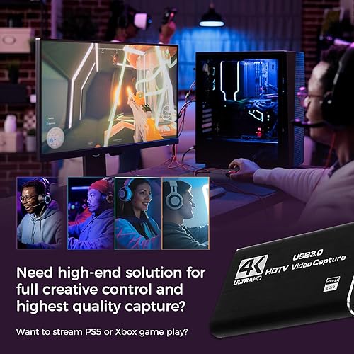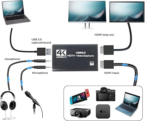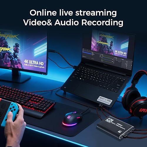 【Plug & Play, Low Latency, Solid Build】This USB3.0 capture card for streaming ps5,xbox, switch works without drivers. Just connect your device—PS5, Switch, or PC—and start recording instantly. The aluminum body improves heat dissipation for stable use during long HDMI game capture or live sessions.