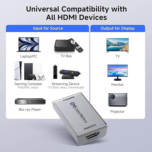 8K Active HDMI Coupler: This active HDMI repeater / HDMI extender / HDMI booster boosts signals by connecting two HDMI cables for longer runs between devices like PS5, Xbox Series X/S, RTX 30/40 GPUs, RX 7900/9000, Apple TV, Blu-ray players, projectors, and more. Use this reliable HDMI booster 8K instead of buying one long, expensive HDMI cable.