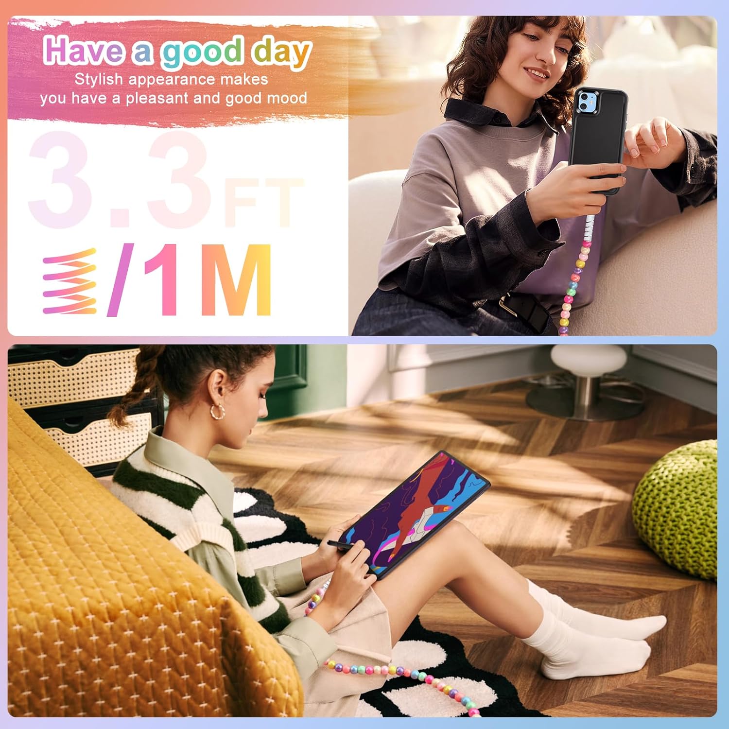 Universal Compatibility: This beaded charging cable is compatible with iPhone 14/13/12/11/ XS Max/ XS/XR/ X/8/ 7/6/5, for iPad 9th/ 8th/ 7th /6th Generation, iPad Air 2, iPad mini 2/3/4/5, iPad 4th gen,iPod Touch 5th gen, etc (Certified by MFi)