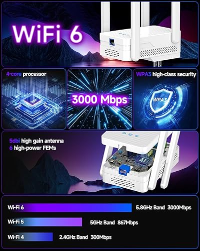 Next-Gen WiFi 6 Performance: Say goodbye to buffering and lagging! Experience faster internet speeds and smoother wireless connections! The AX3000 WiFi 6 Extender delivers blazing-fast speeds with a 2400Mbps 5GHz band and a 600Mbps 2.4GHz band, perfect for 4K streaming, competitive gaming. Whether you're working from home, binge-watching your favorite shows, or dominating online games, this WiFi 6 booster extender ensures a seamless, uninterrupted experience