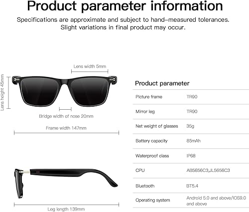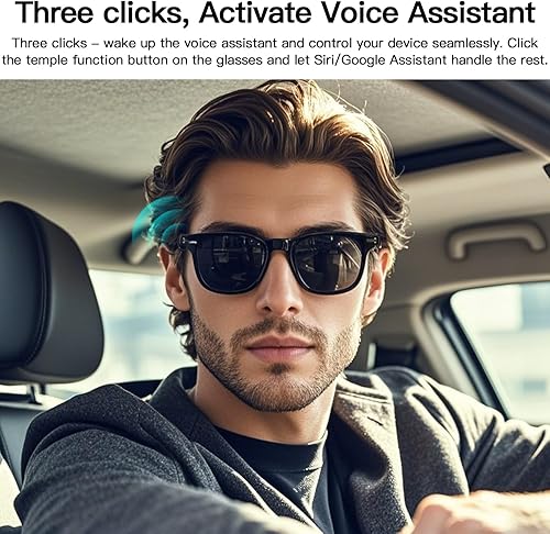【Hands-Free Calling and Music】These smart glasses for business provide convenience while driving or jogging. Easily control volume, calls and music by touching the temples. For the best experience, keep your Bluetooth device volume between 50%-60%;The M01 smart glasses will automatically shut down after being disconnected from the phone's Bluetooth for 5 minutes.