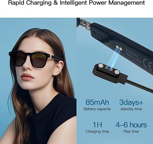 【Long Battery Life & IP68 Waterproof】 GenXenon M01 bluetooth glasses come with 85 mAh*2 battery ,6 h continuous playback, 4 h continuous talk, 72h standby; 1.5h fast charging via magnetic cable. The high IP68 waterproof rating protects against rain, sweat, dust, making it ideal for outdoor intdoor use.