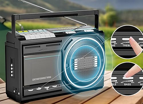 POWERFUL 5 INCH SPEAKERS:This cassette tape player comes equipped with powerful stereo speakers with bass and treble adjustment knobs, enabling you to customize audio and enhance low end impact or brighten highs according to your preference.