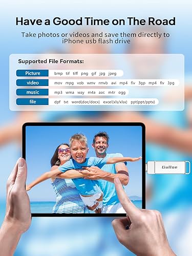 【High Transfer Speed】Transfer photos, videos, and files in seconds with our USB stick. With a write speed of up to 15 MB/s and a read speed of up to 30 MB/s, our flash drive for iphone have higher performance than conventional usb storage flash drive. Save time and get more done with iphone photo storage stick. Enjoy the whole relaxing trip with never stuttering or buffering video play on the go. (Tip: No Third-Party Apps Required, Simply insert the flash drive into the iPhone iPad and go to "Files" app)