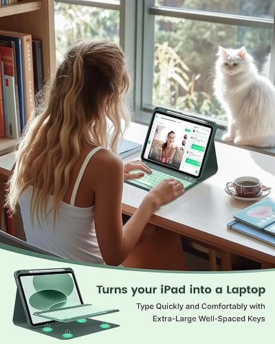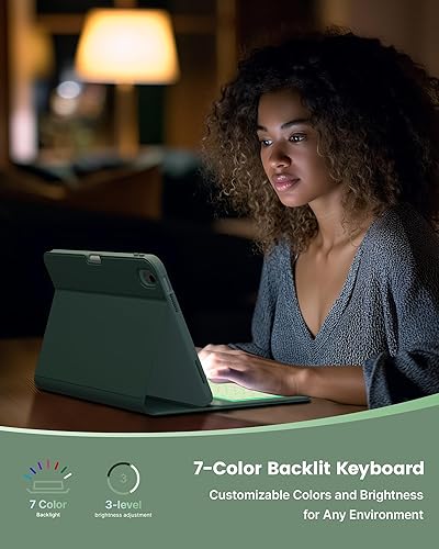 Illuminate Your Typing: Enhance your iPad with a 7-color backlit keyboard and laser-etched keys. Perfect for any lighting, from late-night work to cozy cafés. Enjoy quiet, comfortable typing with customizable backlighting and ergonomic scissor-switch keys
