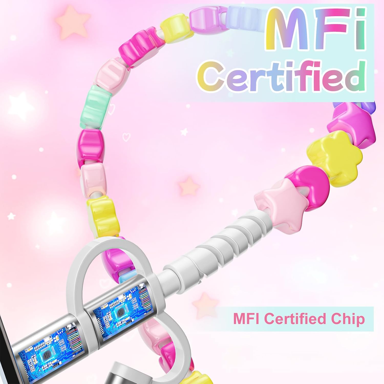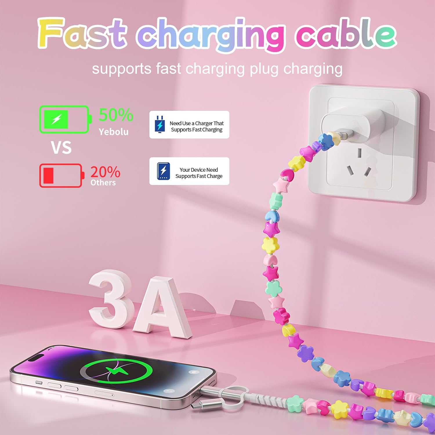 Durable&Cute Colorful Beaded: Unique star + flower + heart pattern candy color beaded design is not easy to confuse with others charging cord, colorful and lovely, catching the eye, compared to the boring white solid color cable, obviously this star + heart + flower beaded charging cable is more characteristic and more lovely and more suitable for the pursuit of cute crowd!