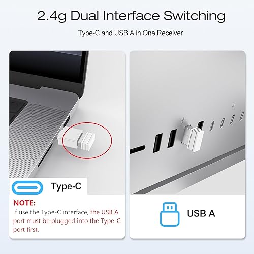 2.4G Receiver Dual Interface: Type-C interface and USB A interface for you to choose, easy plug and play, compatible with All Mac devices 【! ! ! NOTE: if use the Type-C interface, the USB A port MUST be plugged into the Type-C port first】