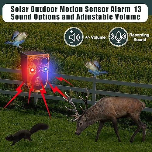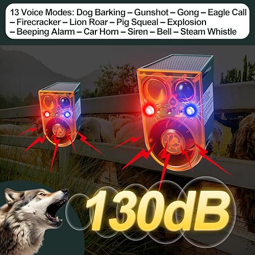 130DB Loud Noise and 13 Sound Options: Equipped with 13 realistic sounds, from barking dogs to firecrackers, this motion sensor noise maker emits 130dB (3 level for option) alarms to deter deer, foxes, raccoons, beers and more. Each trigger lasts 30 seconds for maximum impact