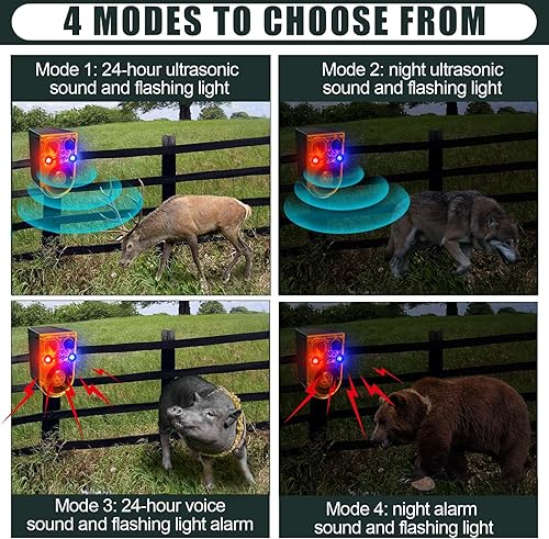 4 Working Modes for Day & Night Protection: Mode A - 24-hour high-frequency ultrasonic sound and light; Mode B - night high-frequency ultrasonic sound and light; Mode C - 24-hour 13 sound alarm and light; Mode D - night 13 sound alarm and light; This motion sensor alarm outdoor protection for gardens and farms