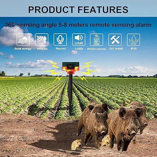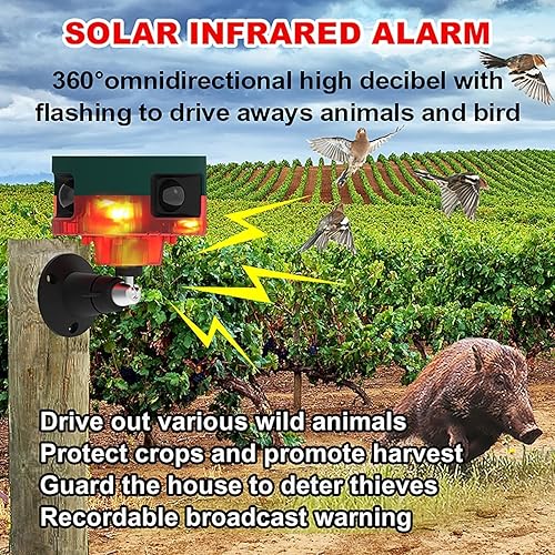 Scare off intruders with a loud solar outdoor motion sensor alarm that blasts dog barking, gunshot sounds, or a piercing siren when motion is detected – perfect for protecting your property from wild animals or unwanted guests!