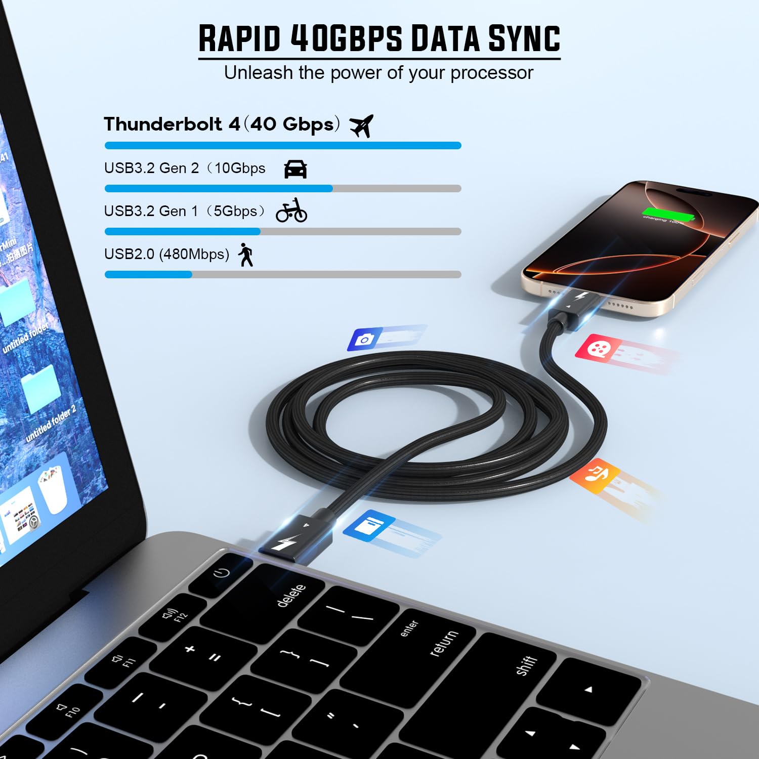 [Wide Device Compatibility]This Thunderbolt 4 cable is compatible with Thunderbolt 4/3, USB4, and USB C devices, and is backward compatible with USB 3.2, 3.1, and 2.0. The Thunderbolt cable can connect to MacBook, iPad, iPhone 16, iPhone 15, docking stations, eGPU, SSD, and more. Whether you're connecting to the latest laptop, docking station, or high-resolution display, this USB C data cable ensures you can build a flexible, efficient, and widely compatible workspace