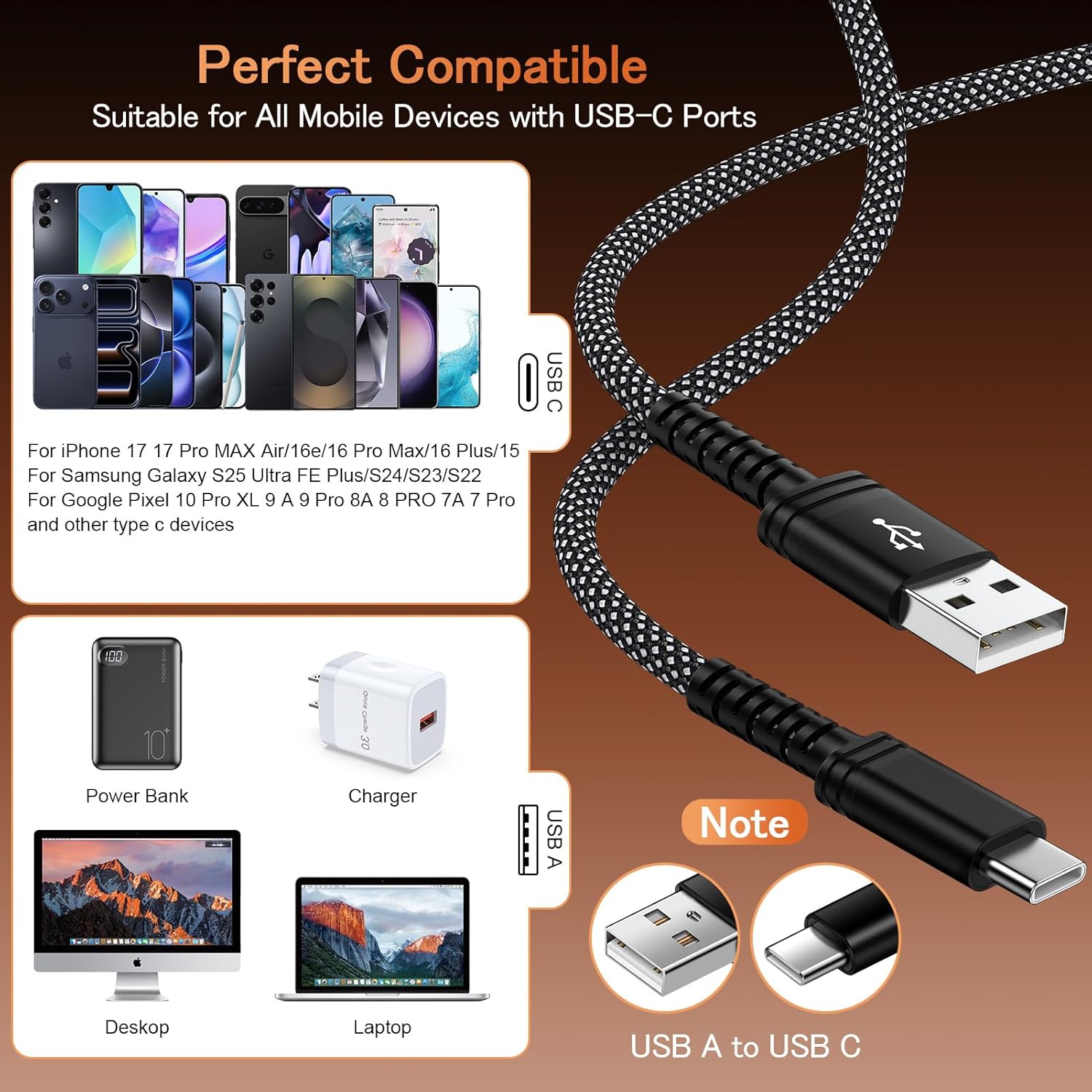 USB-C Cable Compatibility: iphone 17 pro/16 Pro charger cord USB a to usb c charging cable fast Charge iPhone 17/17 Pro/17 Pro Max, iPhone Air 2025,16e,16, iPhone 16 Plus, iPhone 16 Pro, iPhone 16 Pro Max iPhone 15, iPhone 15 Plus, iPhone 15 Pro, iPhone 15 Pro Max Samsung Galaxy S25 Ultra/S24 Ultra FE/S24 Plus/S23 Ultra/S23+/S23/S22/S21/A17 5G/A36/A56/A16/A15/A14/A13 Z Flip 7 6/Z Fold 7 6 ,Google Pixel 10/10 Pro XL/10 Pro/ 9 Pro XL/9 Pro Fold/9 Pro/9/8a/8 Pro/8/7a/7 Pro/7/6a/6 Pro/6/5a/5/4a/4 / Moto Edge/Razr/Razr+ 2025/G Power/G Pure/G Stylus/G Play, most of the Type C phones