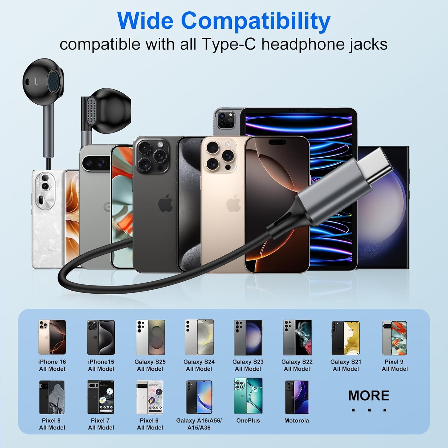 • Universal Compatibility: USB type c iphone 16 headphones wired for Samsung Galaxy S25 FE S25 Edge S25 Ultra S25+ S25 S24 S23 S22 S21 S20 series, A07 4G/A17/A17 4G/A56/A36/A26/A06 5G/A16, Z Fold 7 6 5, Z Flip 7 6 5; Motorola Moto G06 Power/G06/G86 Power/G86/G56/G Stylus 5G (2025)/G Power (2025)/G (2025); iPhone 17 Pro Max/17 Pro/Air/17/16e/16 Pro Max/16 Pro/16 Plus/16/15 series, iPad Pro/Air/Mini, Mac Book/Mac Book Pro/Mac Book Air; Google Pixel, LG, OnePlus, and other devices with USB C audio port.