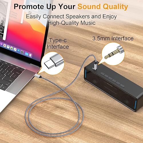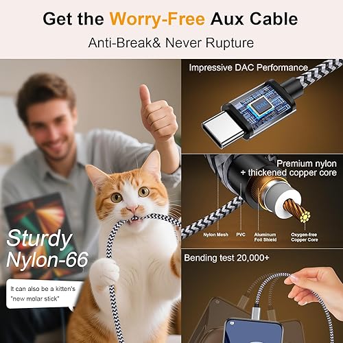 Durable & Tangle-Free : type c aux cord Reinforced nylon braided cable + reinforced nylon braiding withstands 20,000+ auxiliary to usb c bend tests+premium aluminum alloy shell connector can radiate heat better and ensure stable signal transmission with daily use .