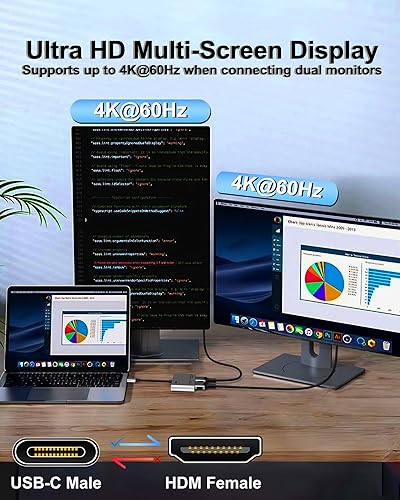 【Dual 4K@60Hz UHD Display】This USB C to DisplayPort adapter supports resolutions up to 4K@60Hz for a single monitor, or dual monitors via DisplayPort MST technology (3840x2160@60Hz each). Also supports 1440p and 1080p @60Hz. (Note: ONLY when your devices support 4K resolution, the video output will be 4K,please make sure to use a DP 2.0 cable or better.)