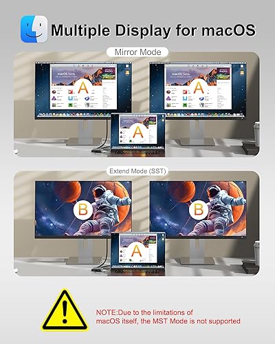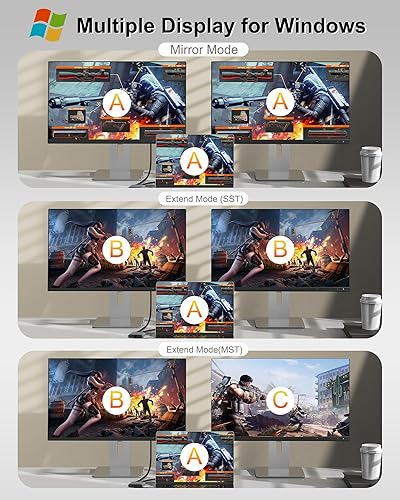 【Multiple Display Modes】For Windows OS, this USB-C to Dual DP Ports adapter can supports two monitor to display different screens(A-AA、A-BB、A-BC). For Mac OS, it only support mirror mode(A-AA、A-BB), and cannot extend two different screens due to Mac OS limitation