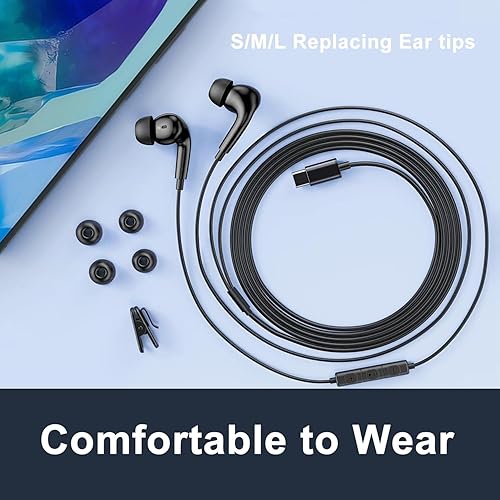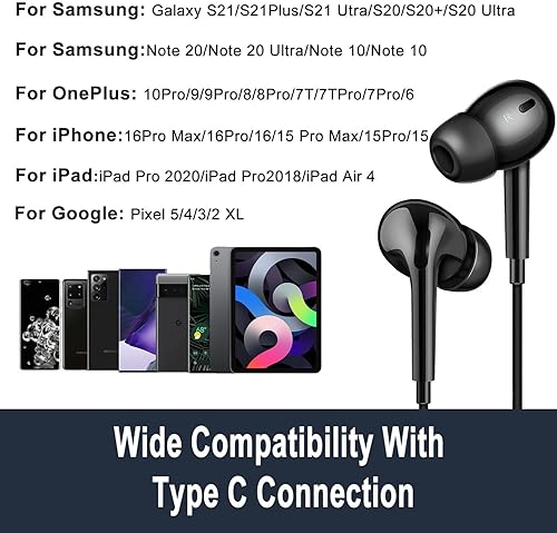 【Comfortable In-Ear Design】USB C Earbuds for ergonomic in-ear design delivers more powerful and clear sound, allow you to have clearer phone calls, you can feel comfortable even after long hours of wear. Ideal for leisure, work, study, travel, fitness exercise or other outdoor activities.