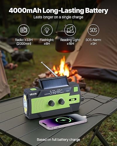 Long-Lasting Battery: The 8000mAh battery powers lighting, radio, reading, and SOS for up to 72 hours. This solar hand crank emergency radio also serves as a phone charger so you can stay connected during camping trips or blackouts