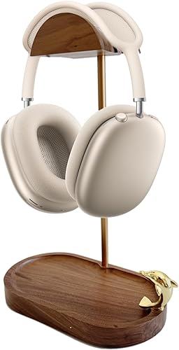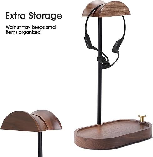 Functional Organization: Our walnut headphone holder stand features an integrated storage tray at the base, perfect for keeping small essentials like apple AirPods, earphones, keys, cables, or USB drives neatly organized